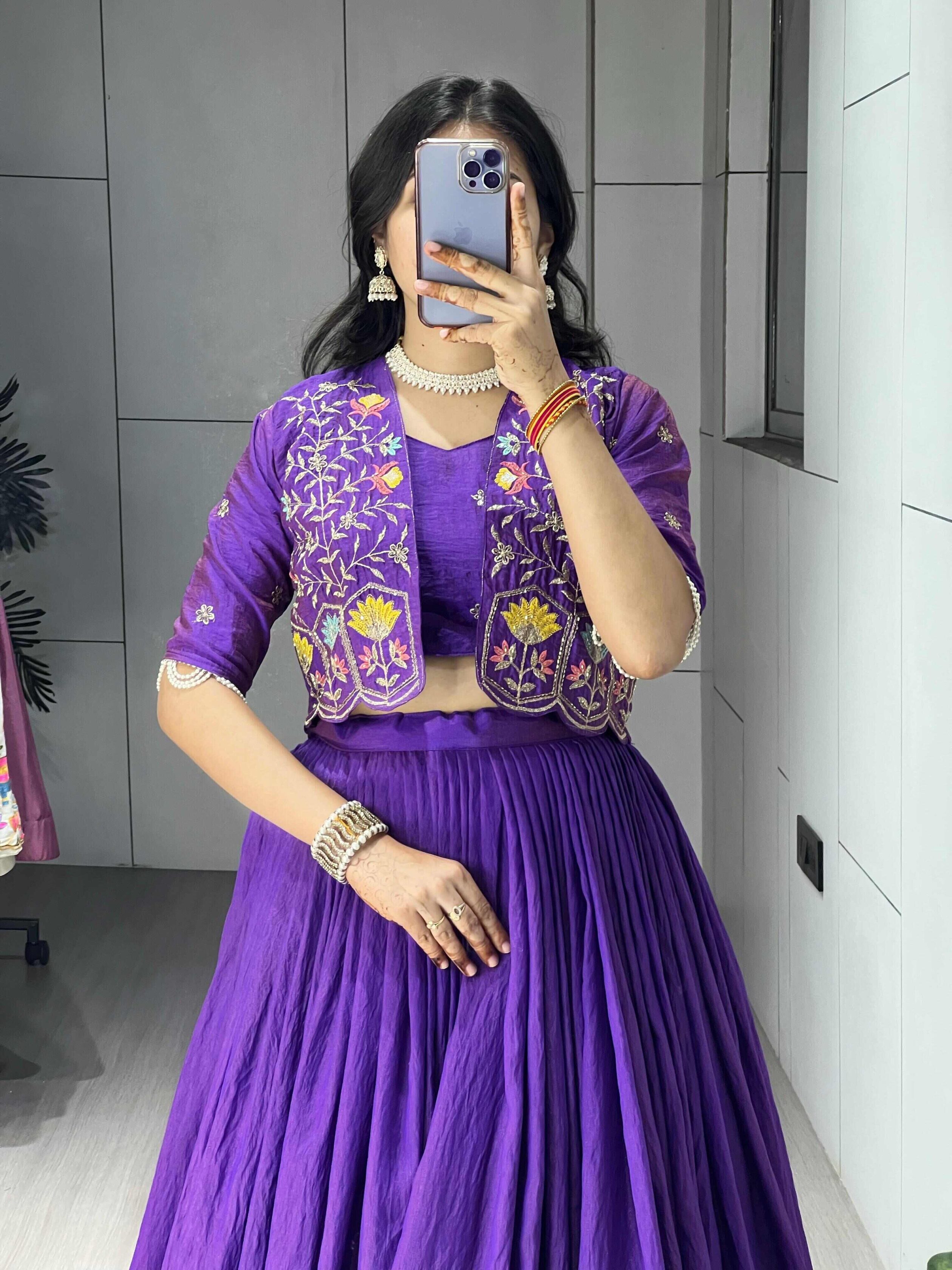 This elegant Indo-western ensemble features a Embroidered Koti, pleated lehenga skirt with a crushed texture, paired with a matching crop top. The look is highlighted by a short, open-front jacket adorned with vibrant multicolored floral embroidery and pearl-detailed cuffs, definitive choice for weddings, festive celebration, or event where making a statement is essential._✨