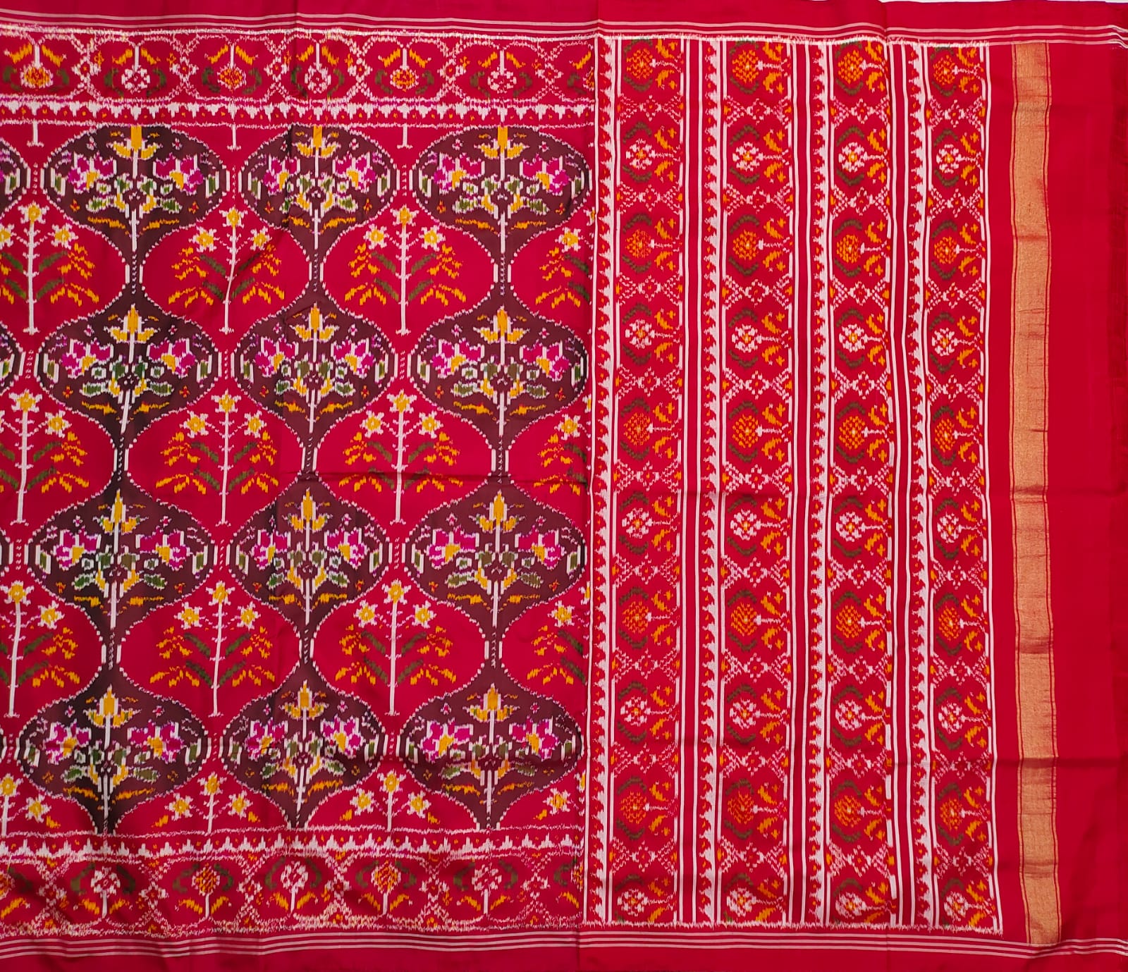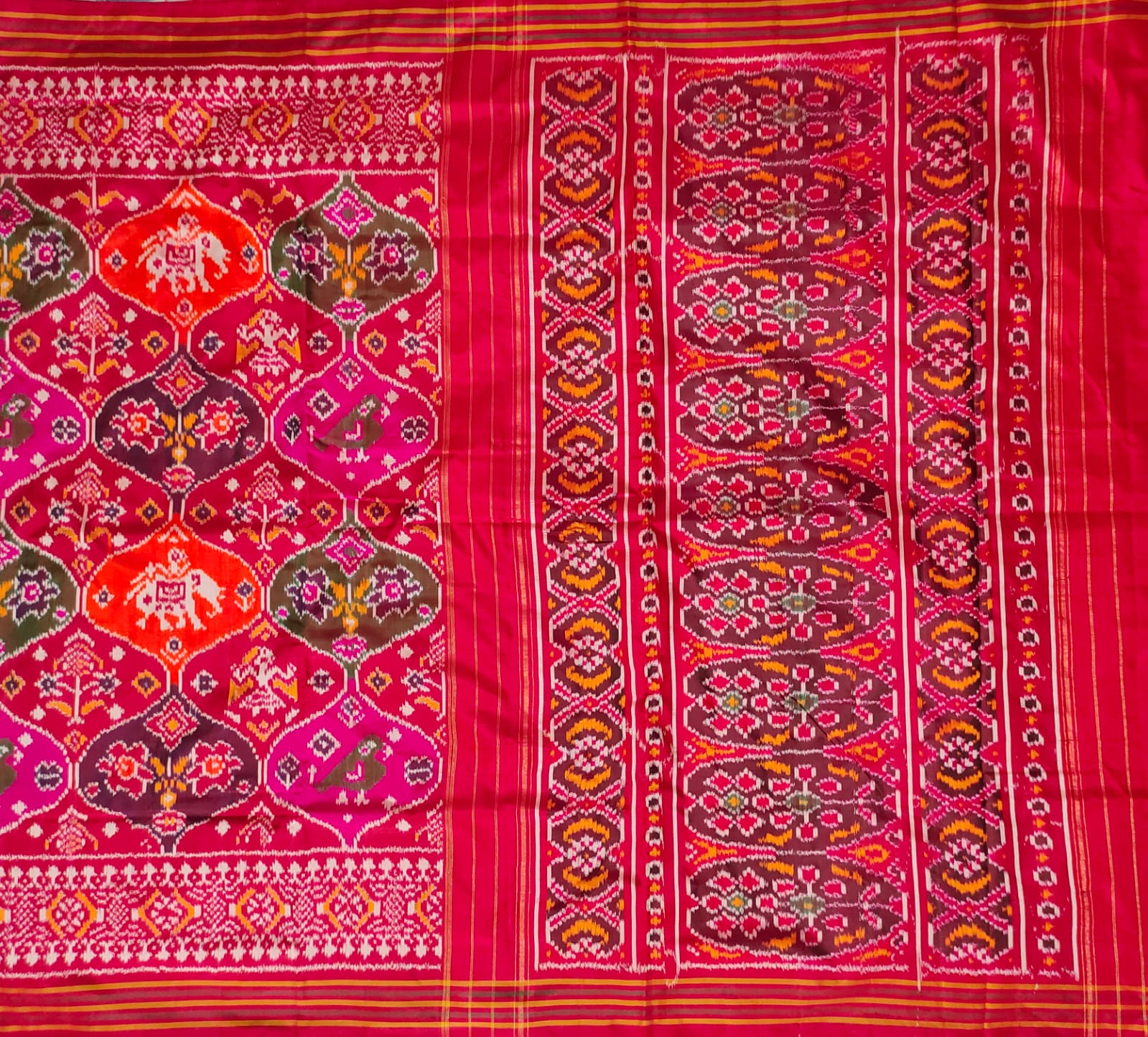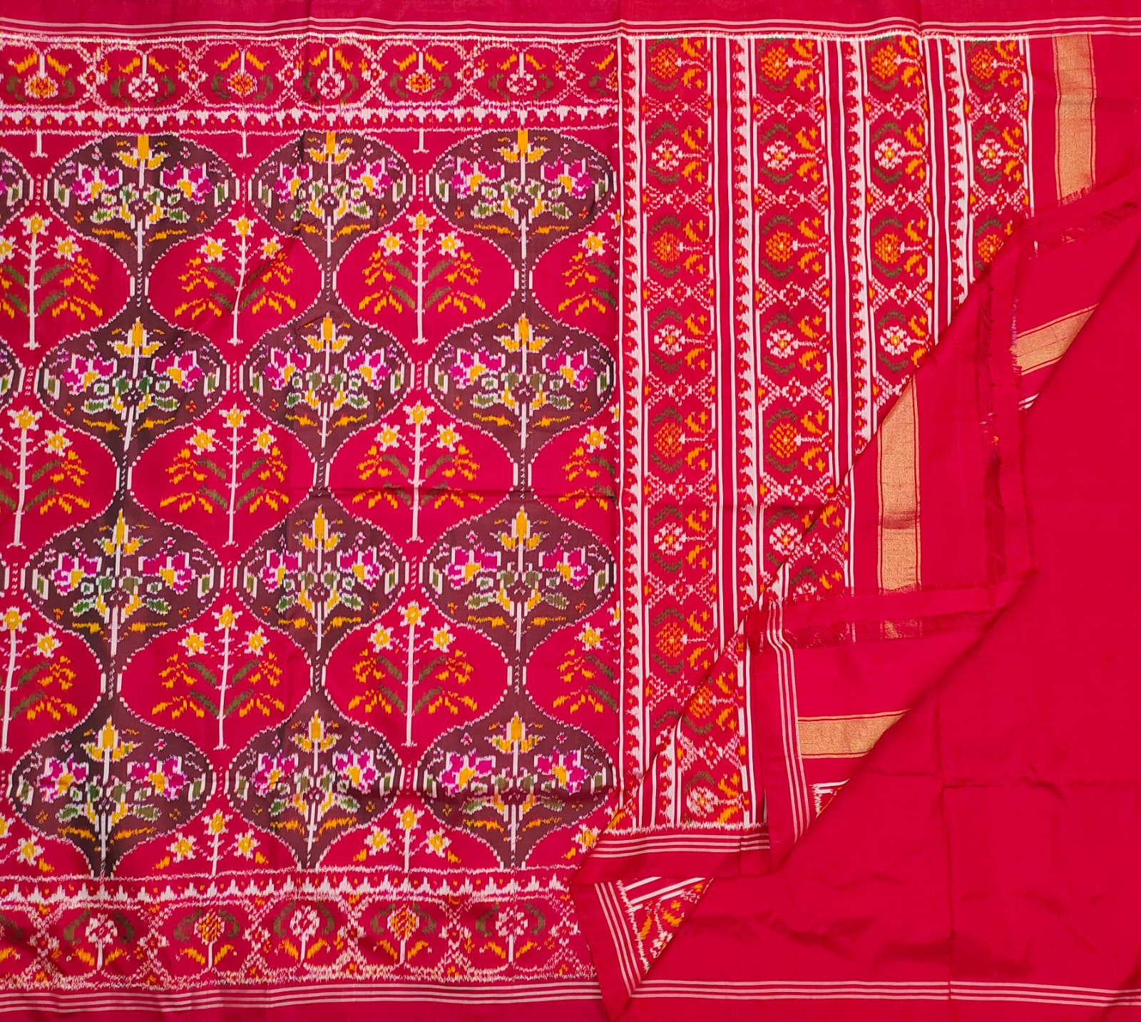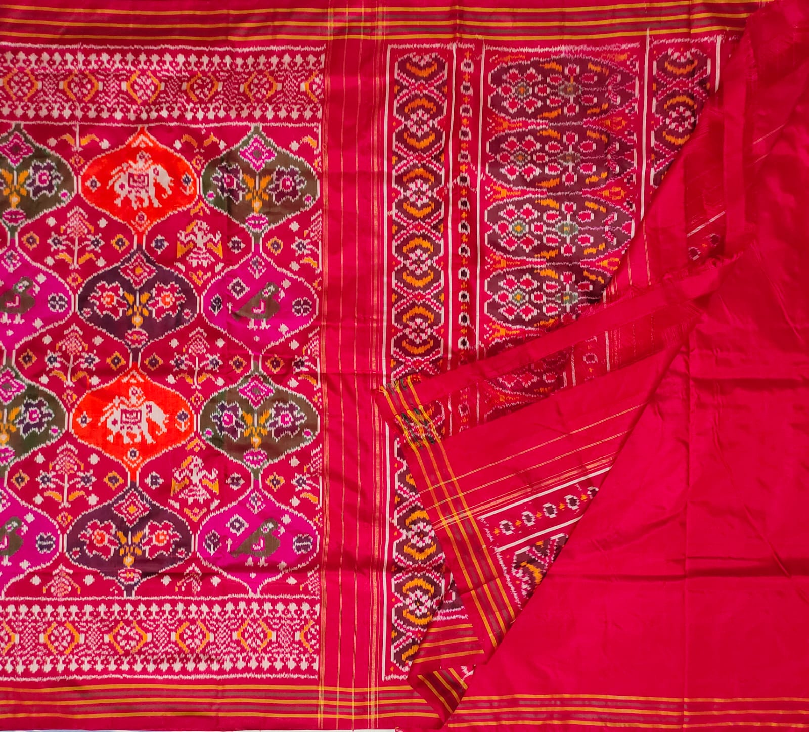 This handloom Red & Maroon pure single Ikkat Patola Saree exudes elegance and refinement. Purely Handwoven. It features intricate flora and fauna with Birds, Animals and Flower design all over