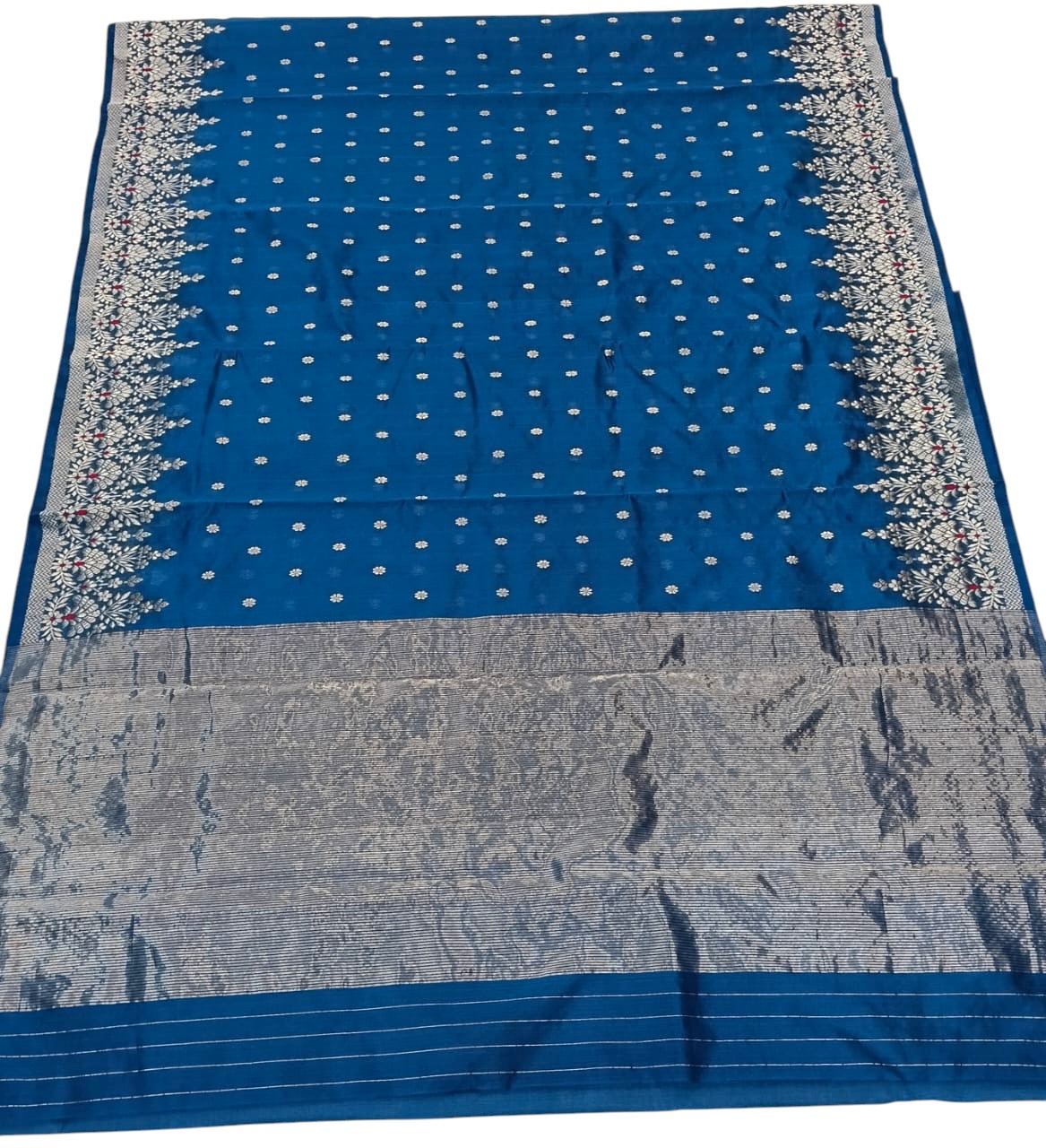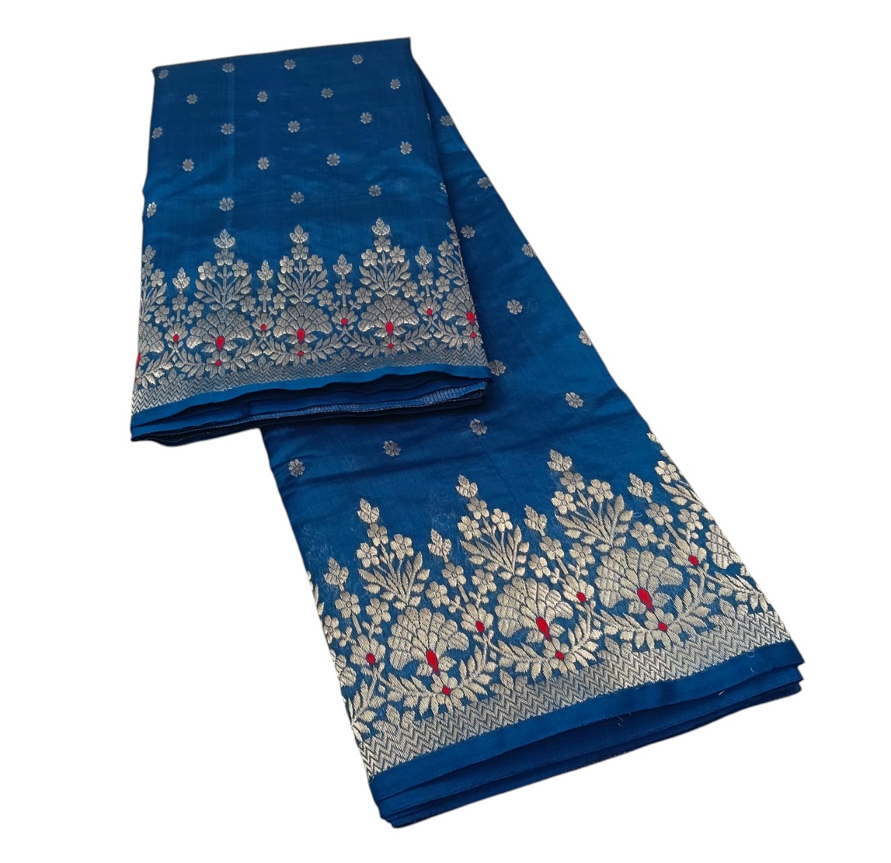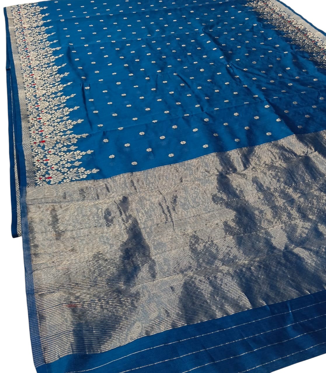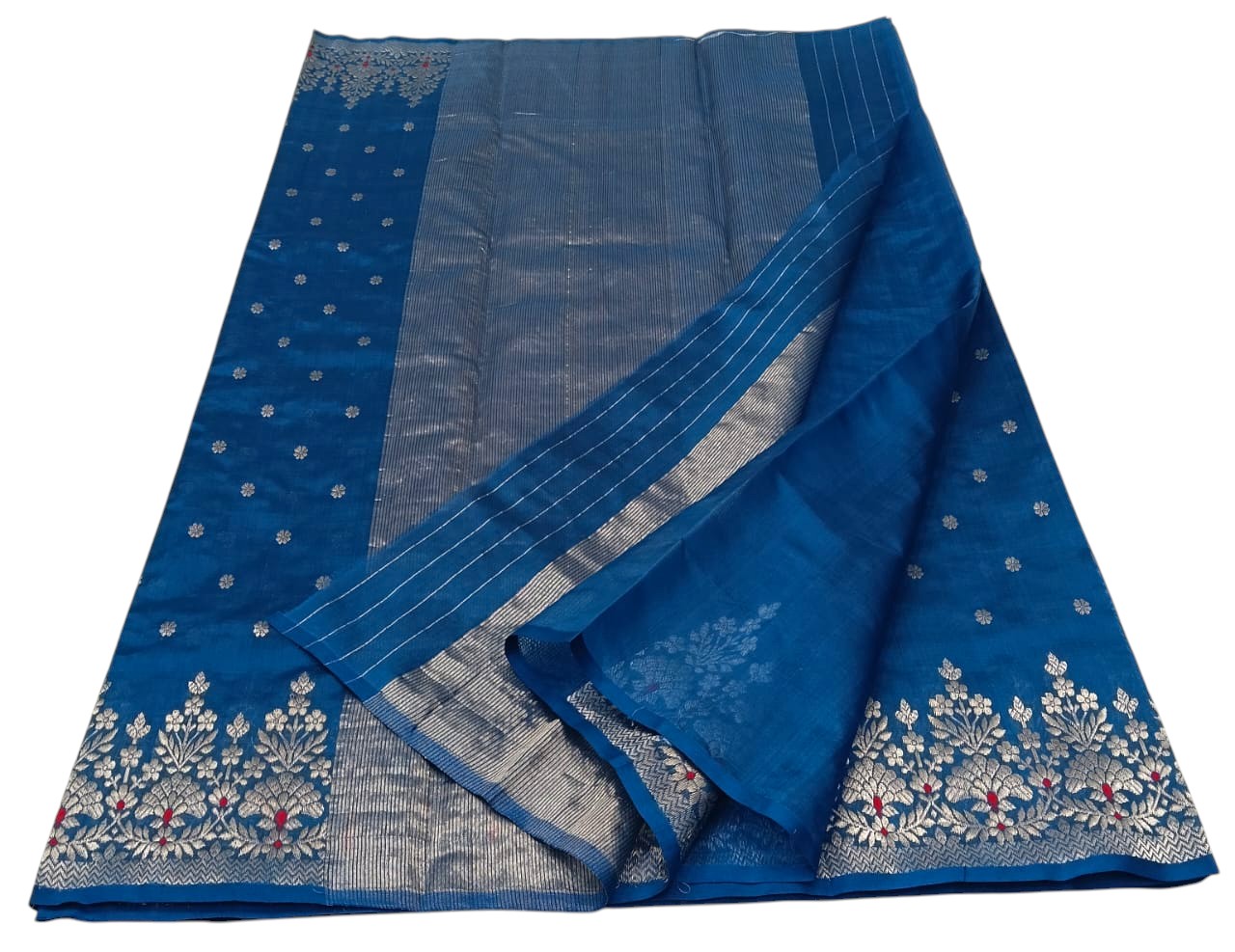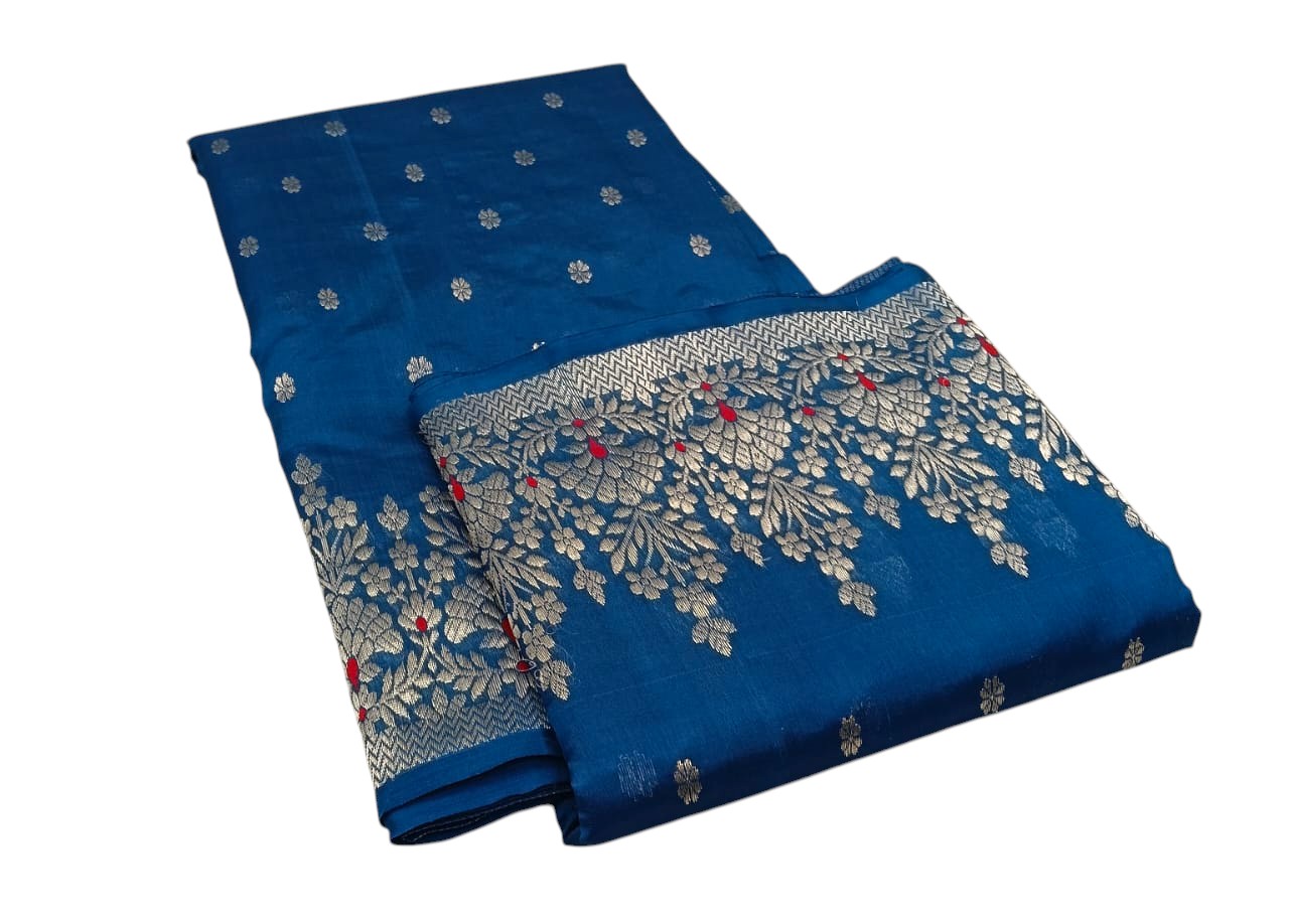 A dashing blue Shade Chanderi Saree with Silver Motif handwoven in Pattu silk comes with a matching unstitched blouse fabric. This Saree is handwoven in finest natural materials