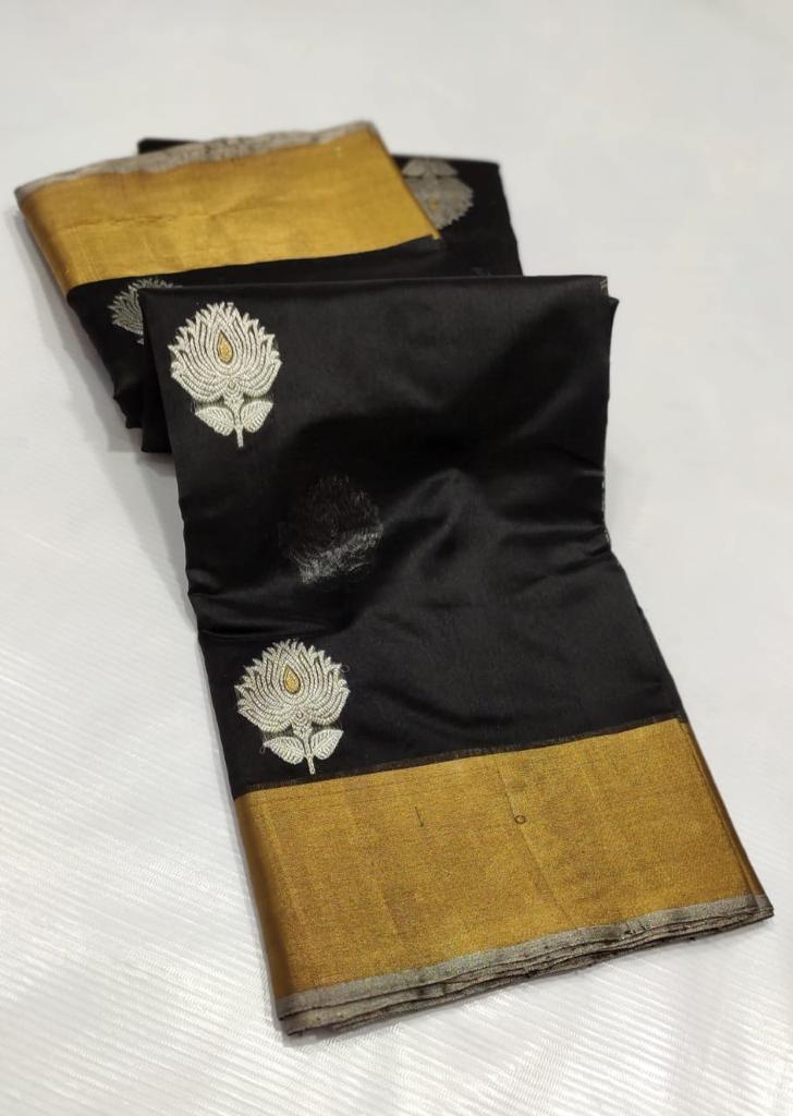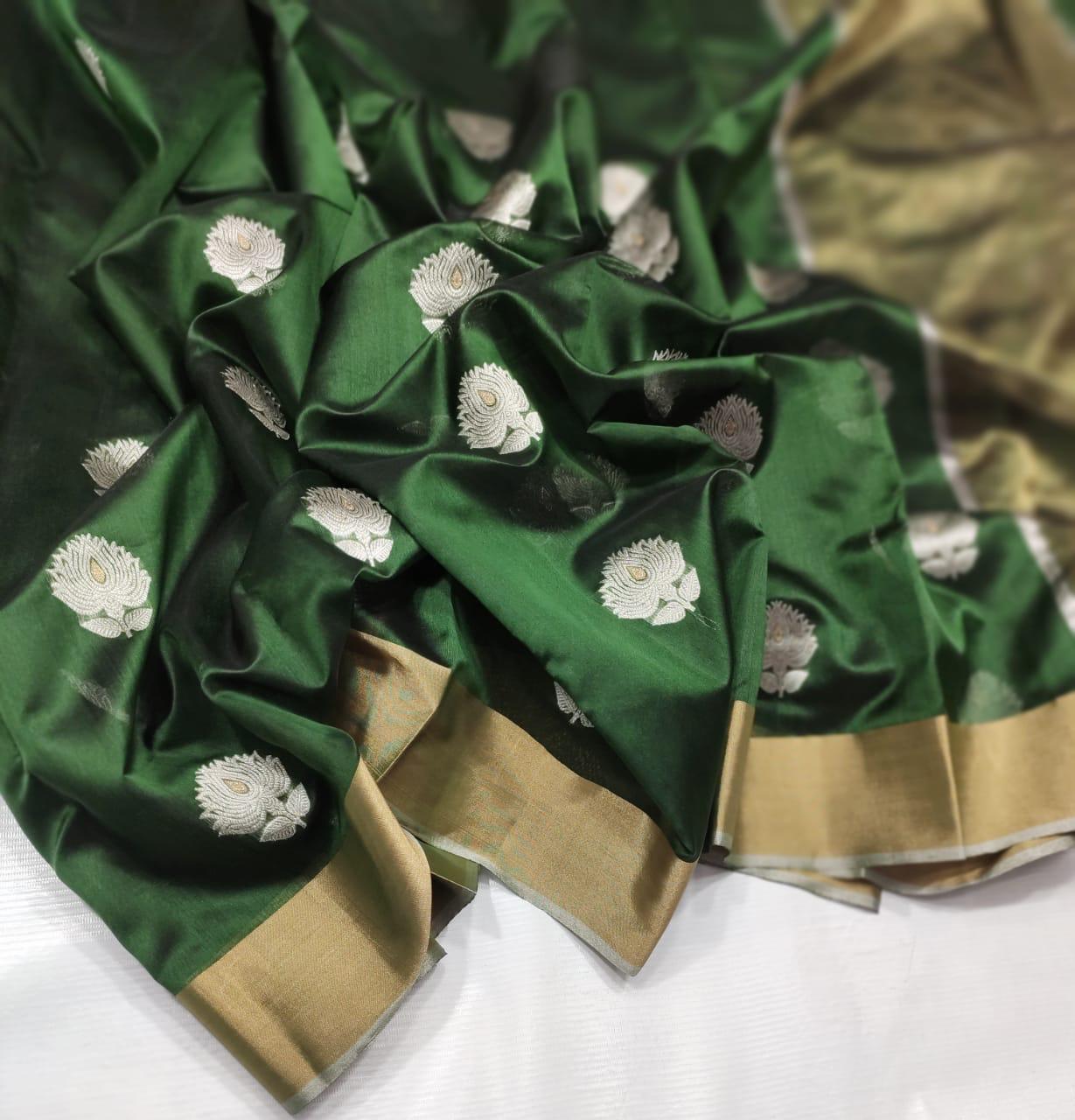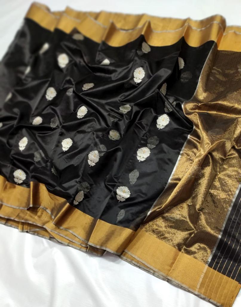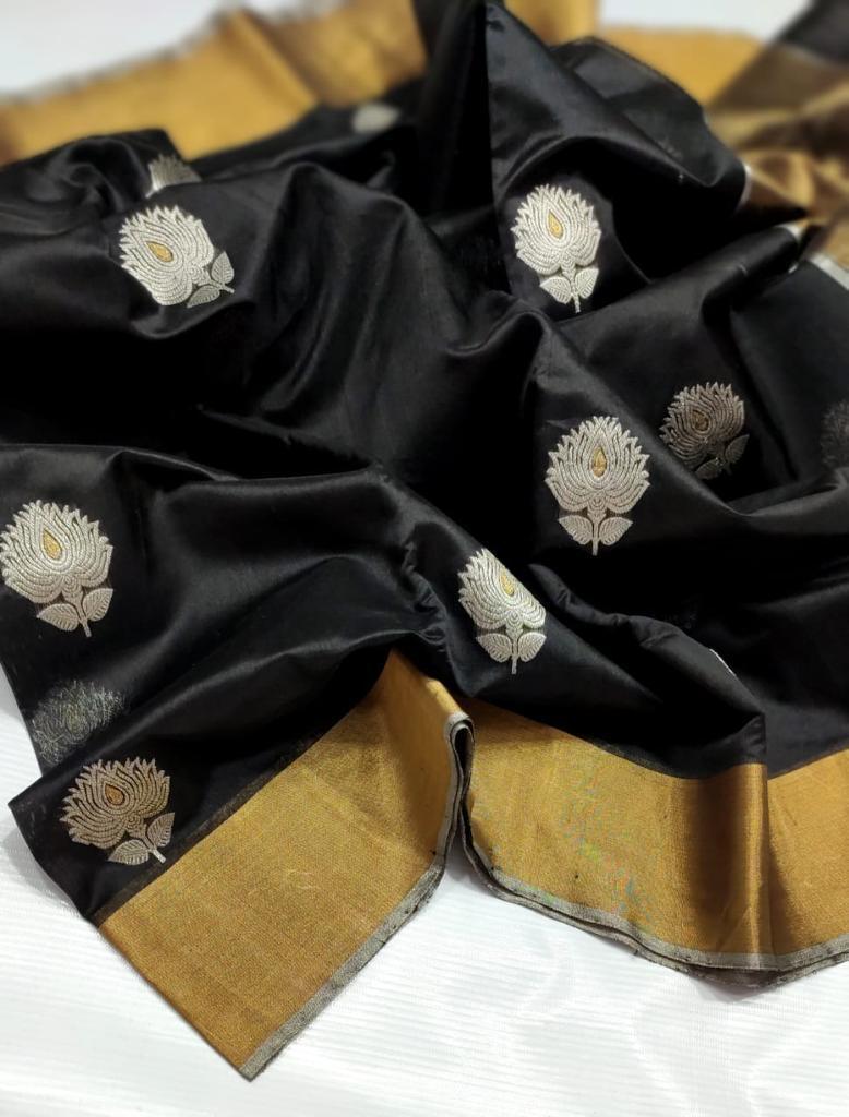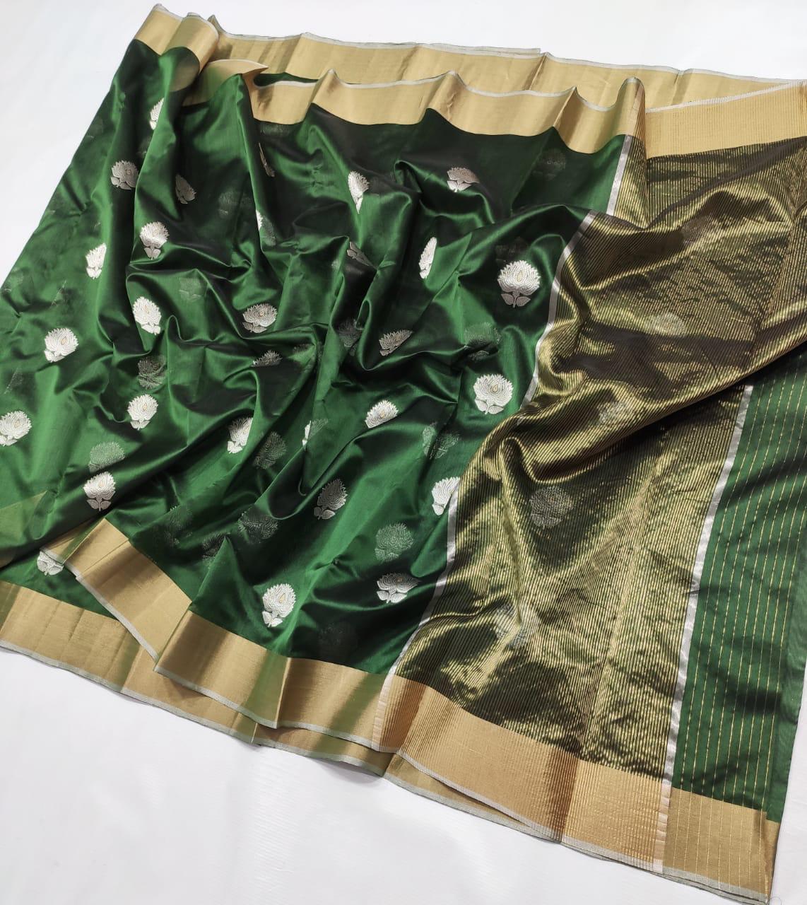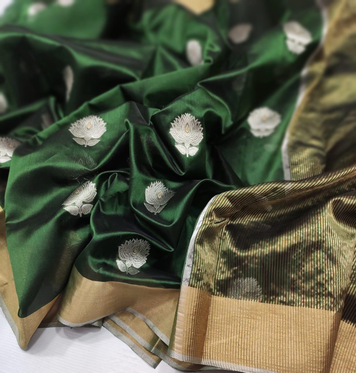 Intricate Motifs (Butis): These sarees often feature small, handwoven motifs or “butis” inspired by nature, such as flowers, leaves, coins, and geometric shapes. These butis are a hallmark of Chanderi weaving and are intricately crafted using zari threads.