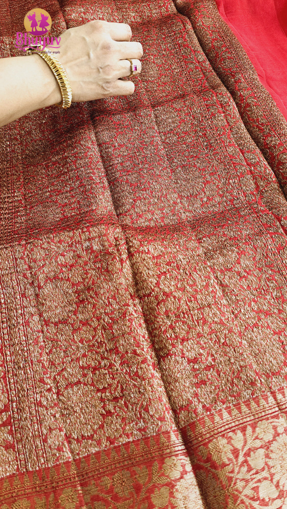 Adorned with delicate Golden zari work, the Banaras Kora Organza Handloom Saree gleams with subtle shimmer, enhancing its allure and making it perfect for special occasions and celebrations.