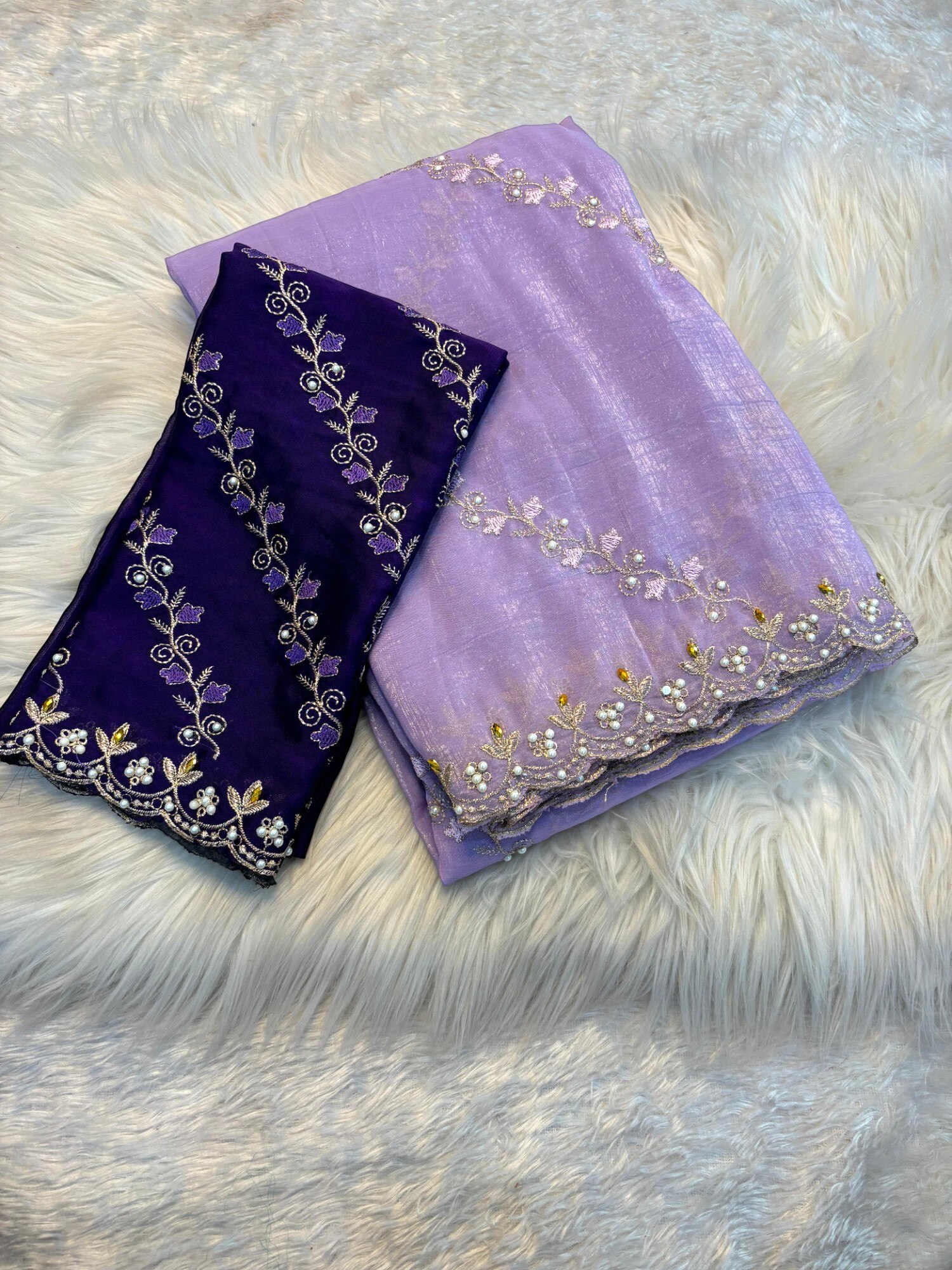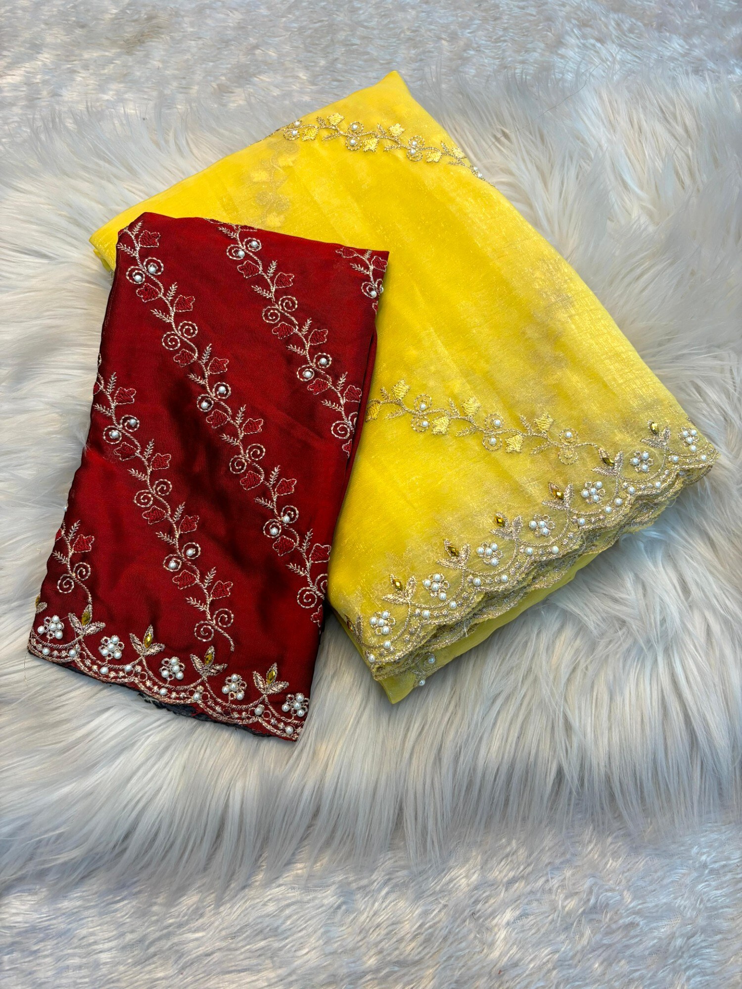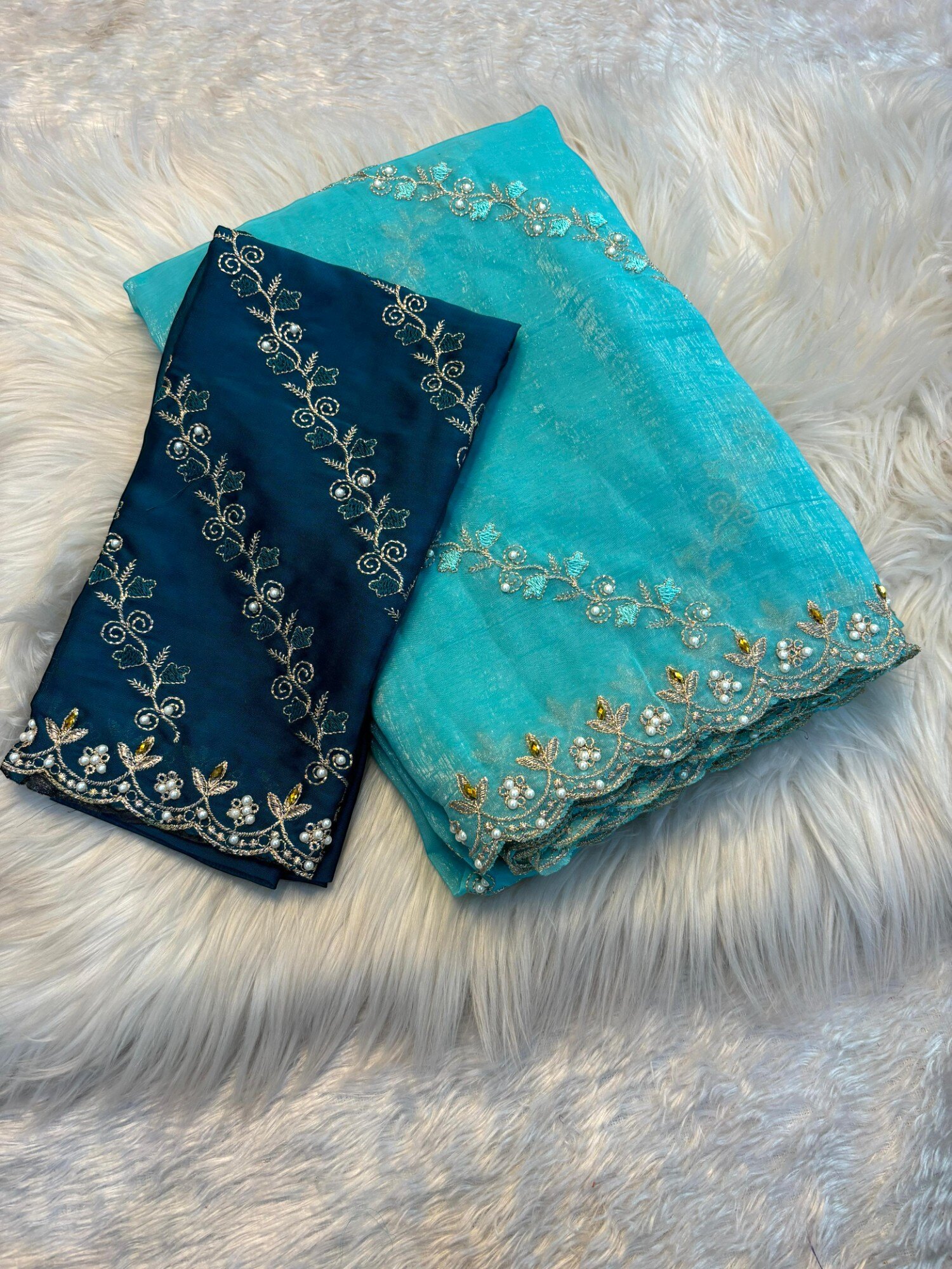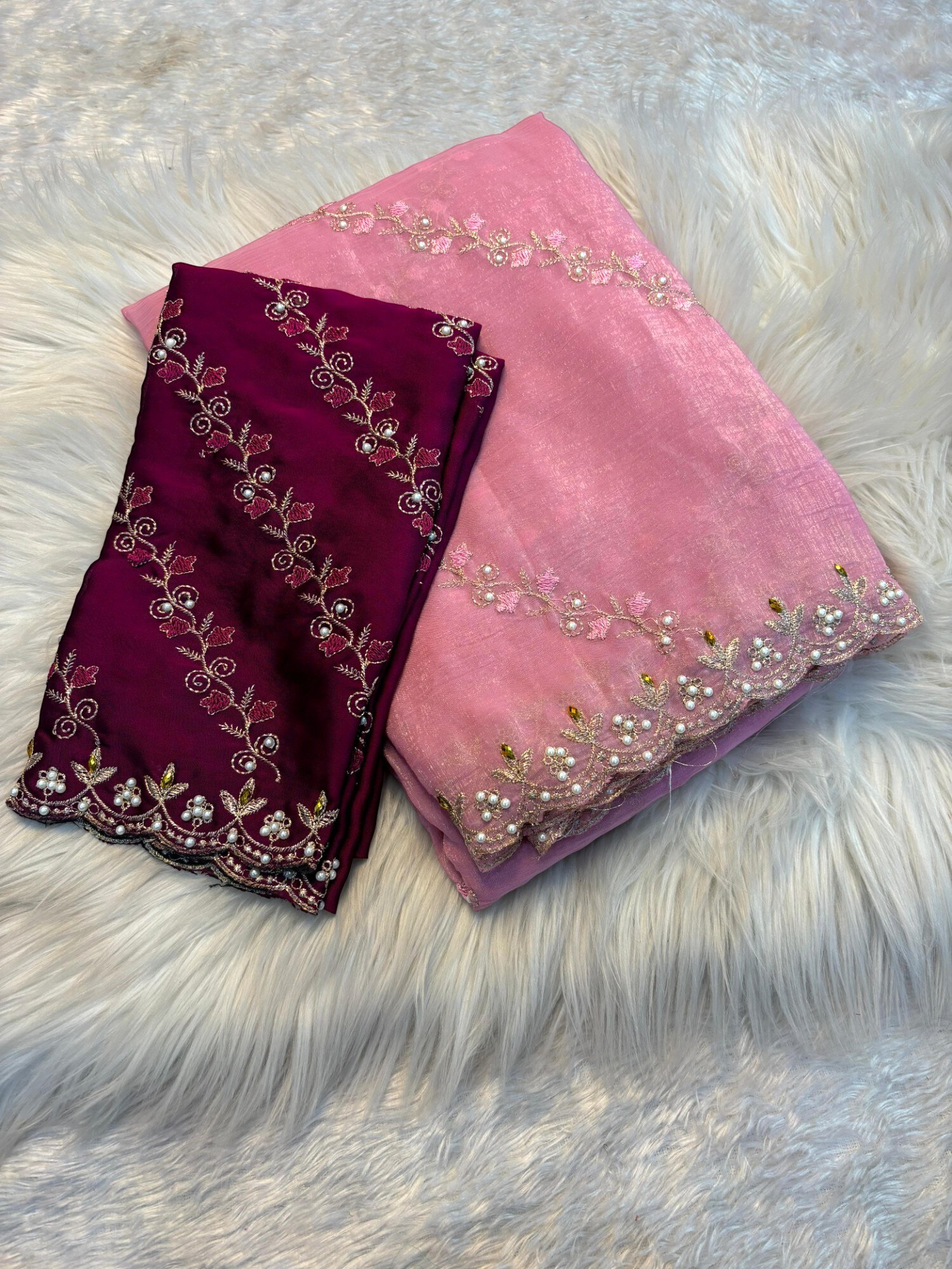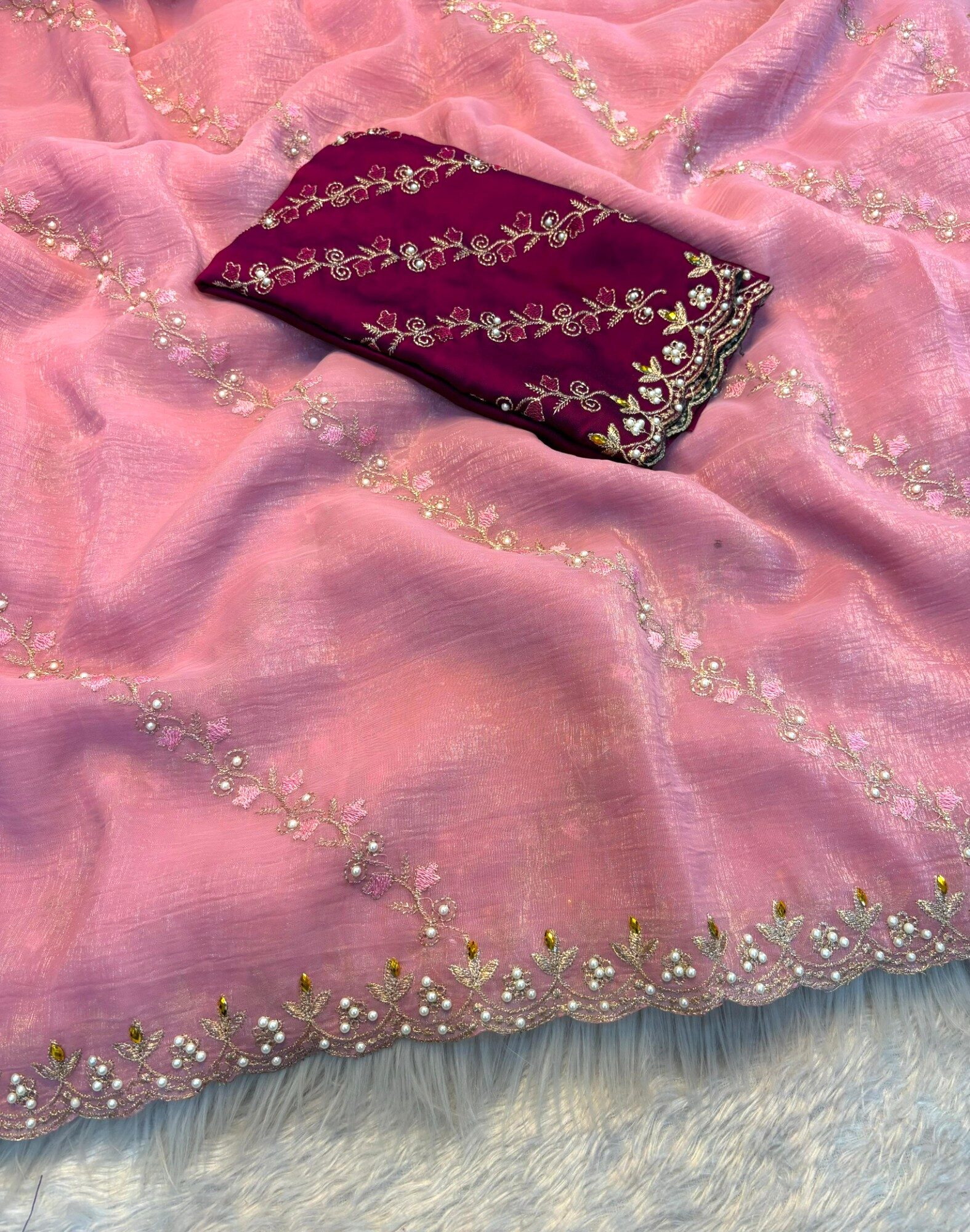 “Soft Crunchy Embroidery Sarees with contrast blouse” describes a beautiful and desirable combination of features in a saree, making it suitable for various occasions, from festive gatherings to more formal events.