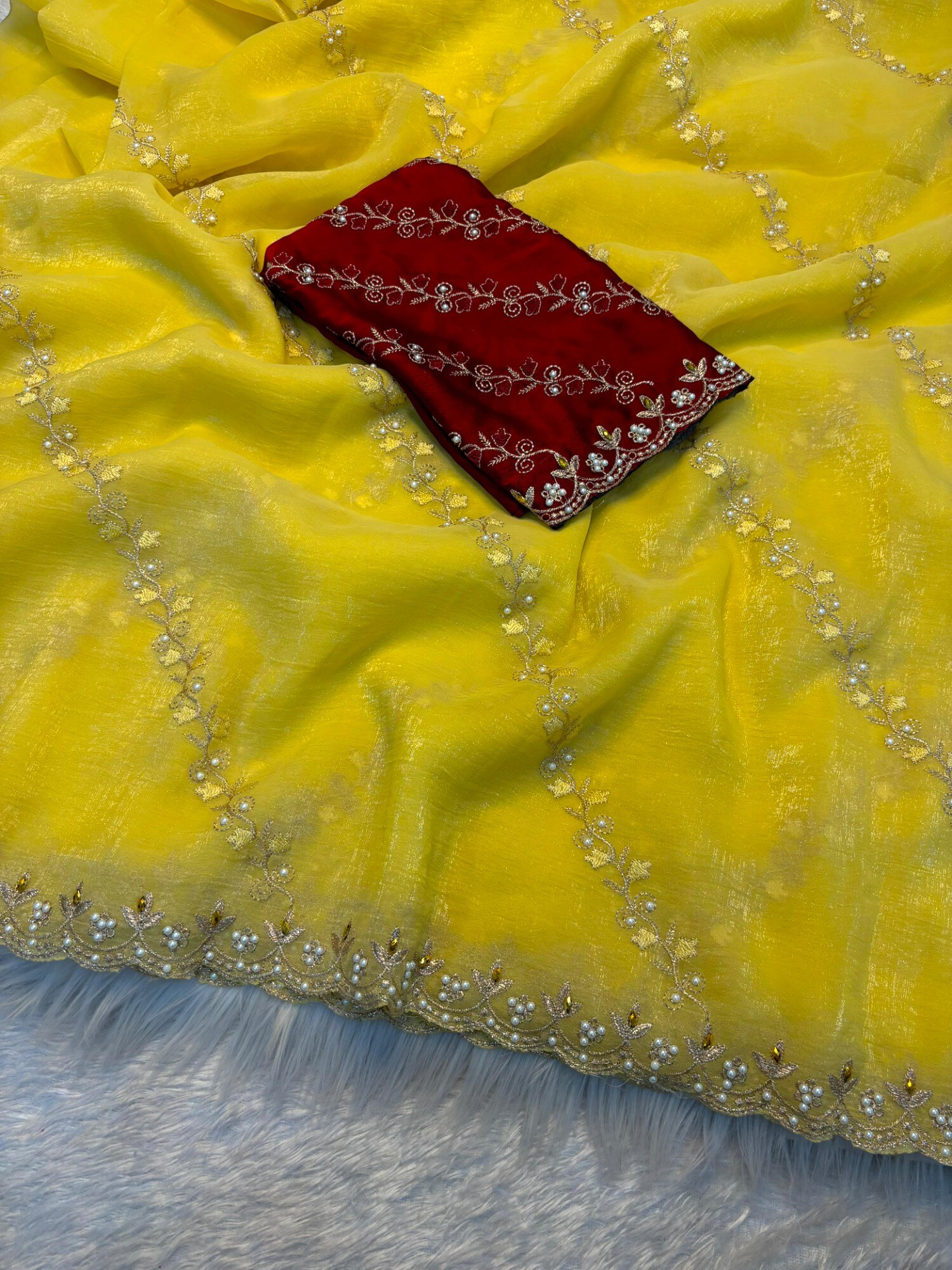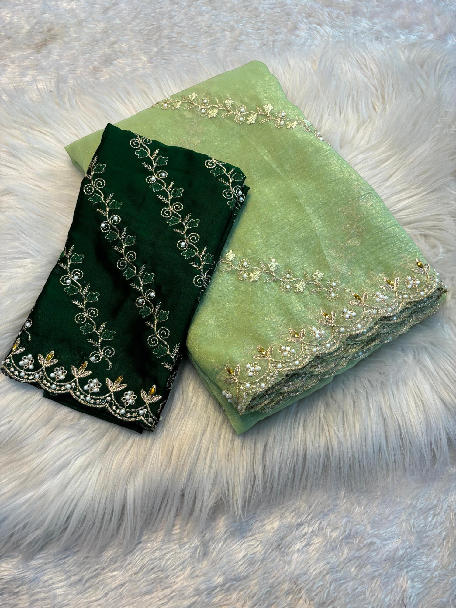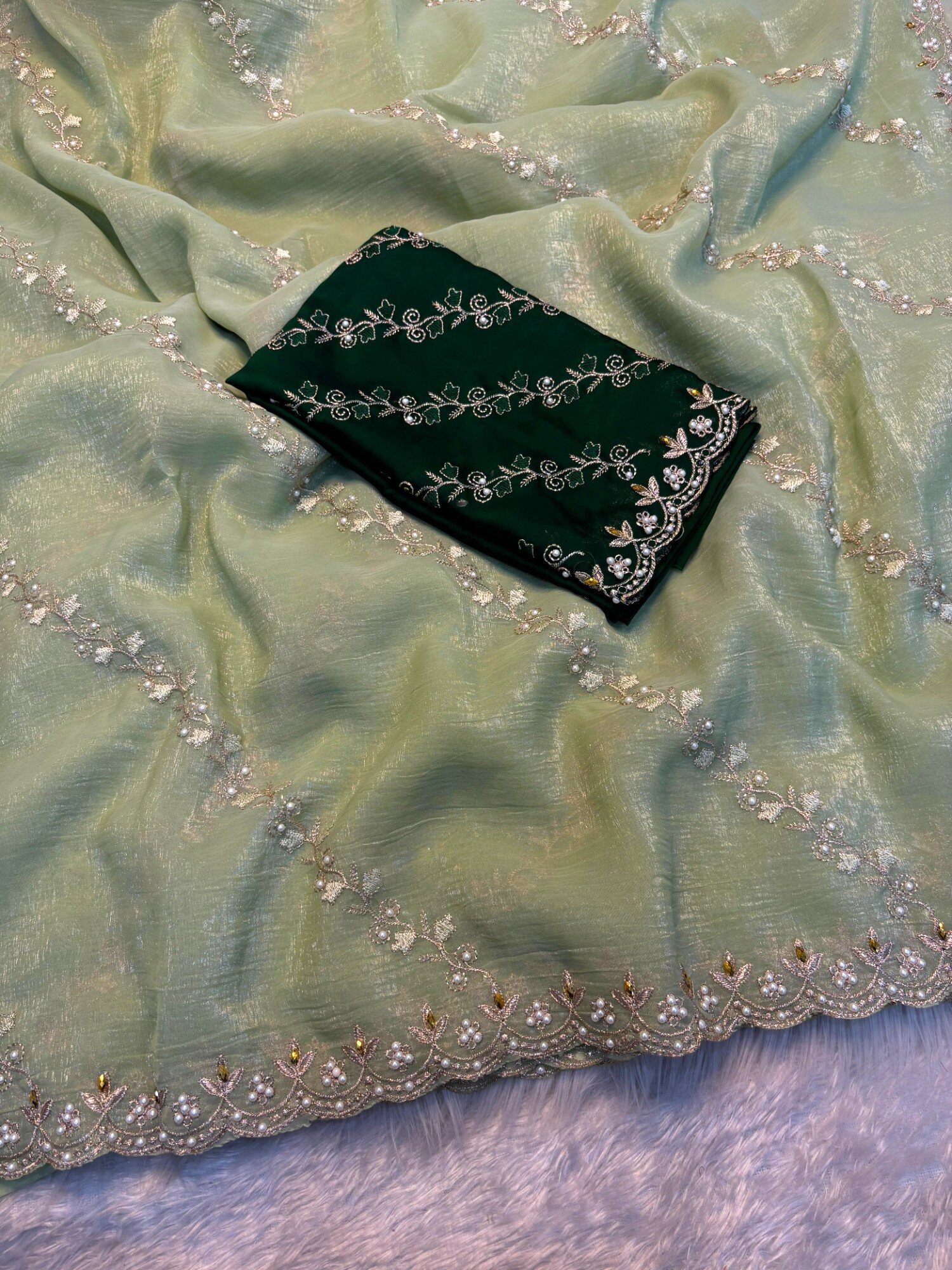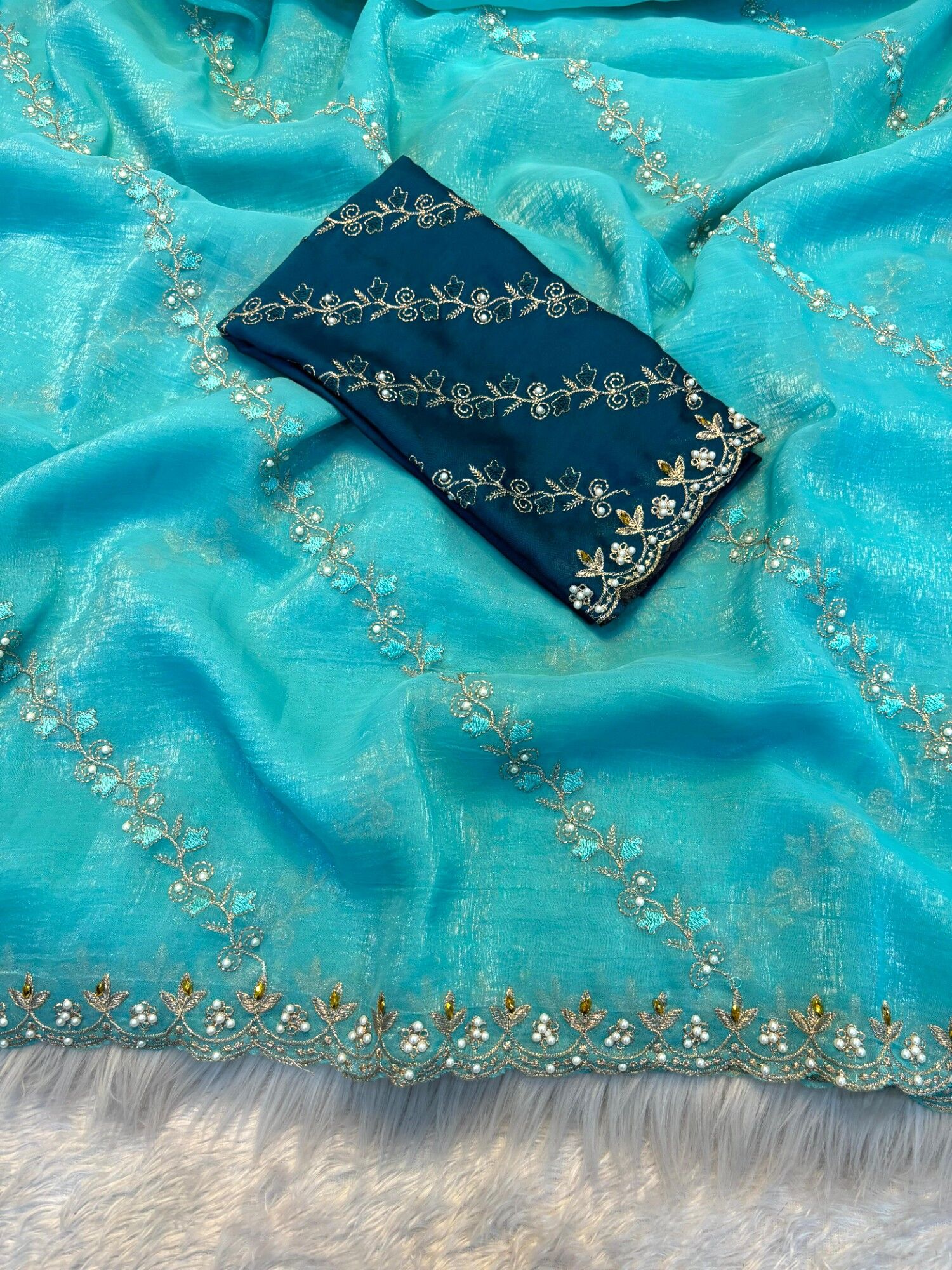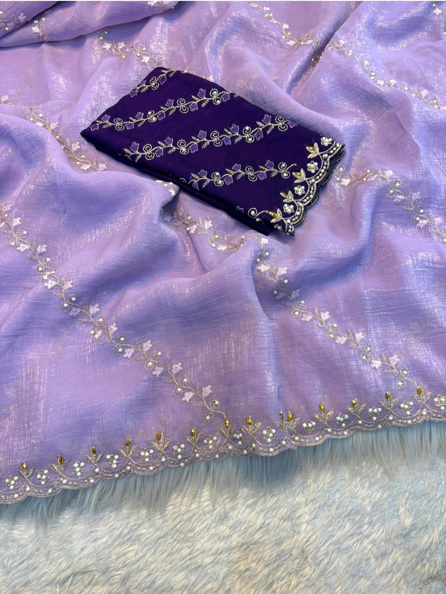 “Soft Crunchy Embroidery Sarees with contrast blouse” describes a beautiful and desirable combination of features in a saree, making it suitable for various occasions, from festive gatherings to more formal events.